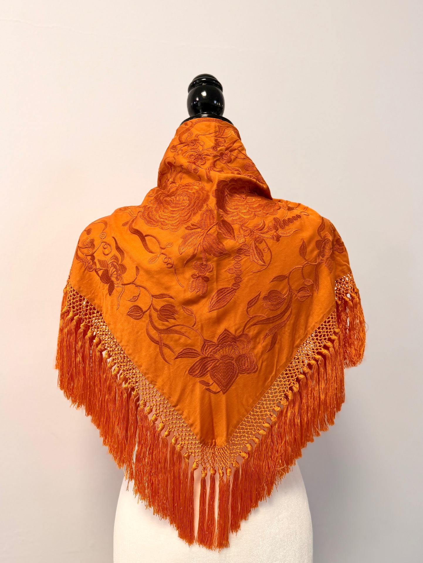 Mantón triangular, seda bordado en seda. Mide 80x110x80 sin contar los flecos. Diseño y producción propio de Mantones Luanda.