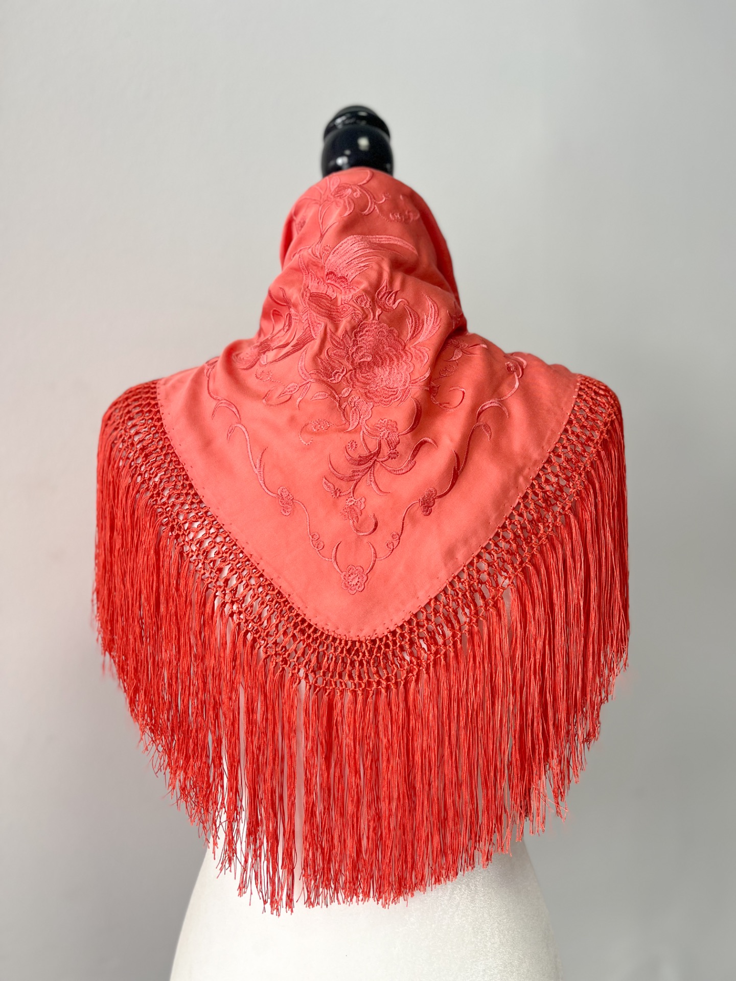 Mantón de seda, bordado en seda. Mide 60x60 sin contar flecos.