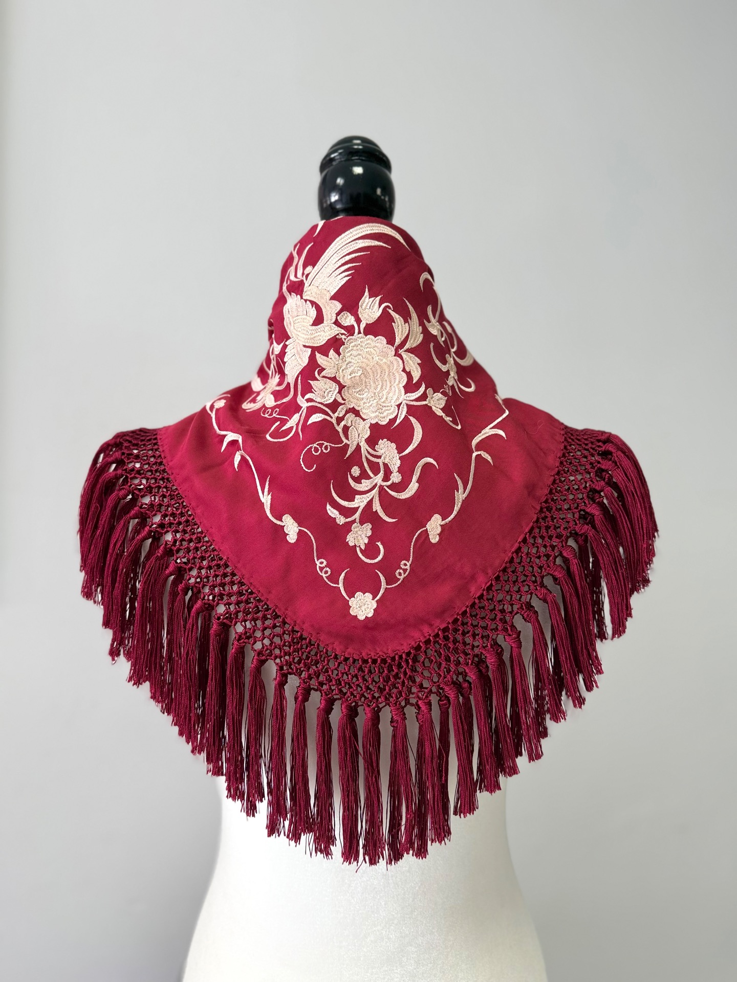 Mantón de seda, bordado en seda. Mide 60x60 sin contar flecos.