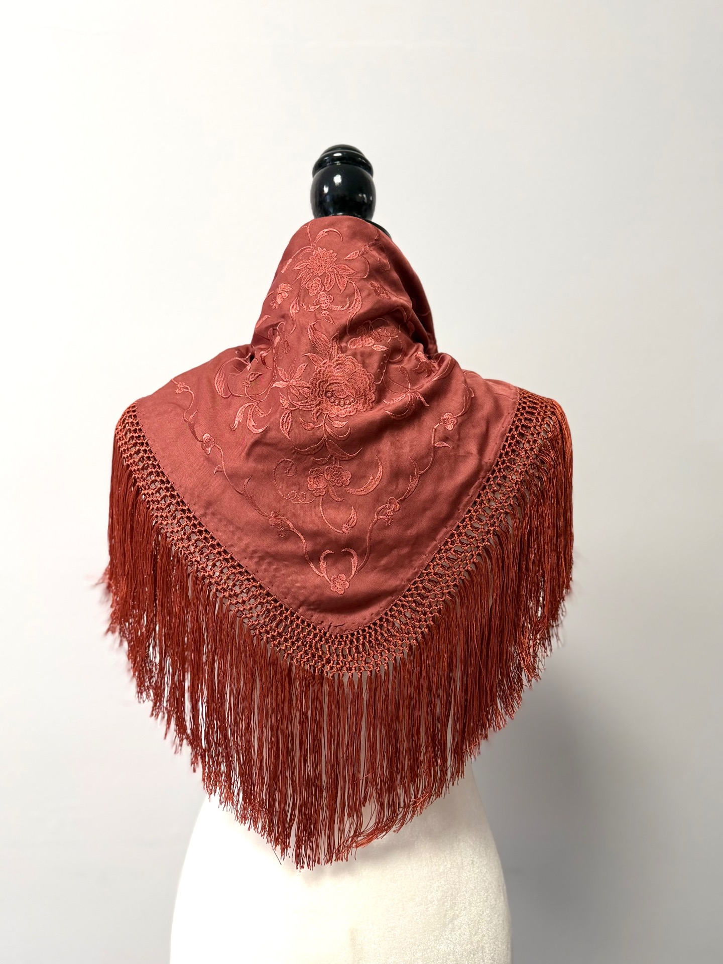 Mantón de seda, bordado en seda. Mide 60x60 sin contar flecos.