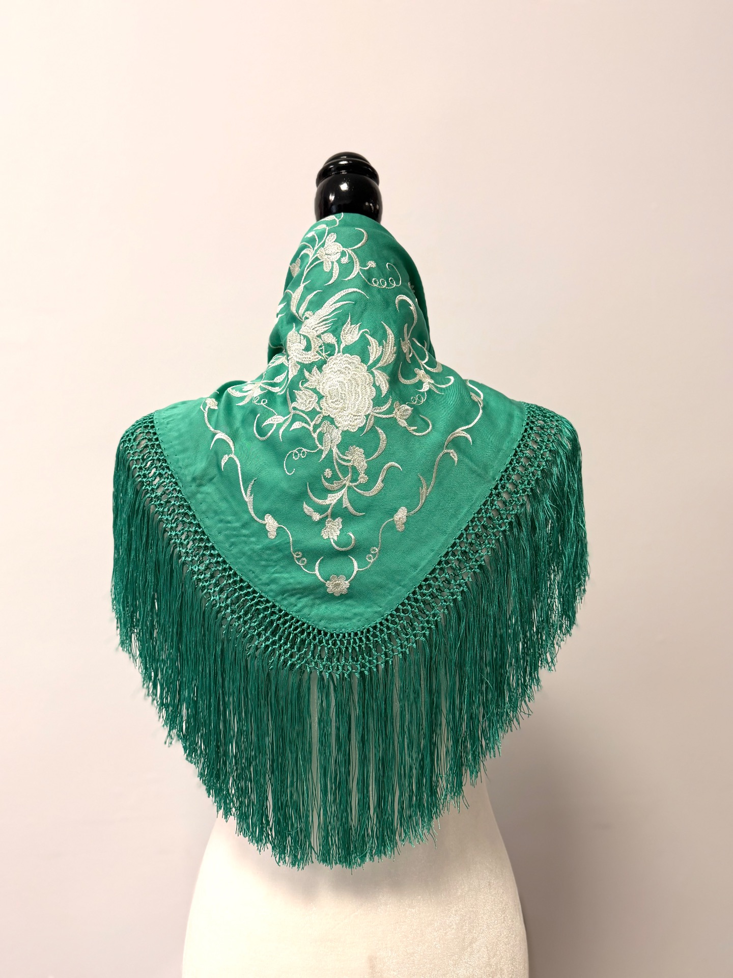 Mantón cetrería verde agua bordado blanco CUADRADO 60x60