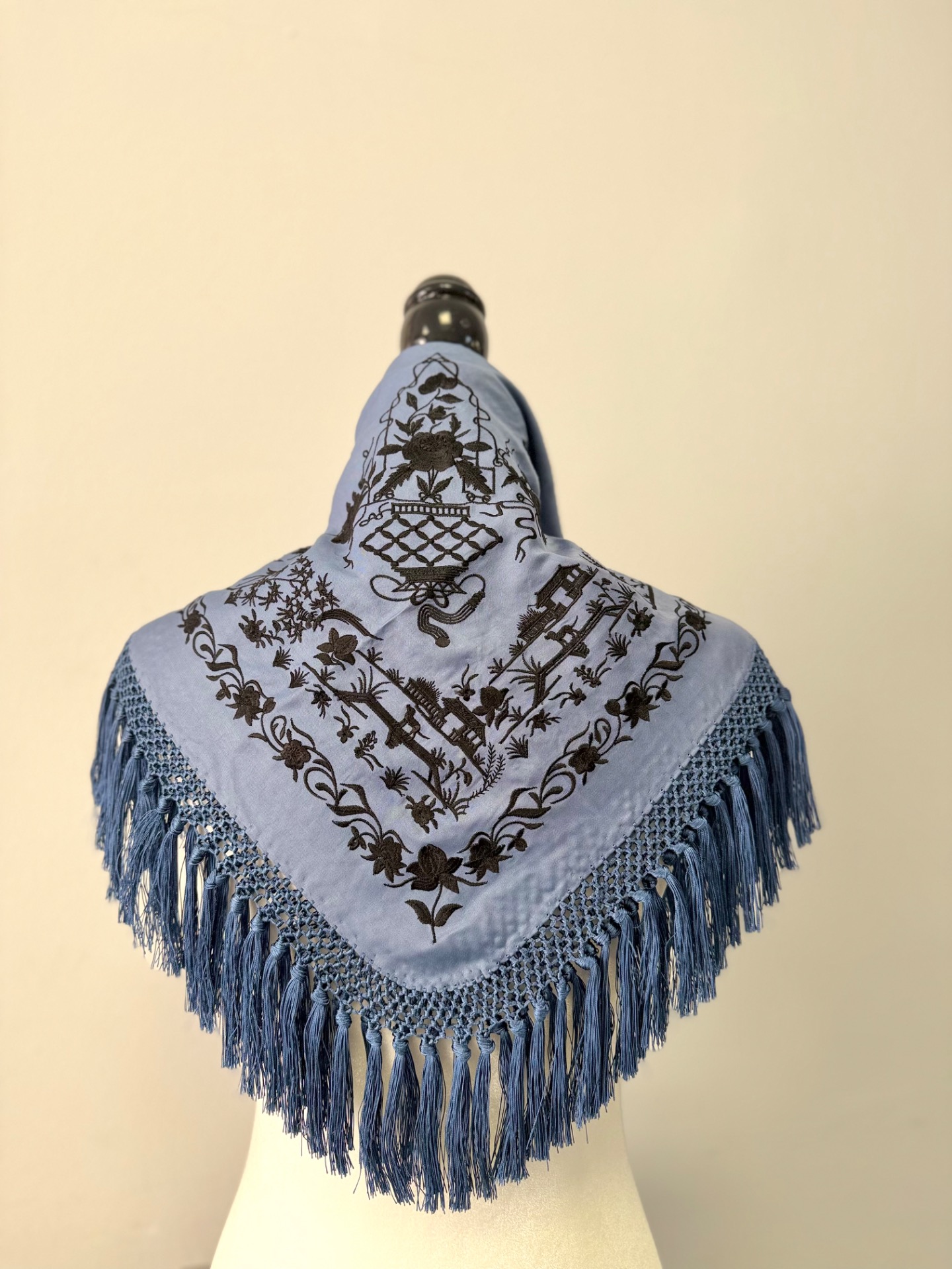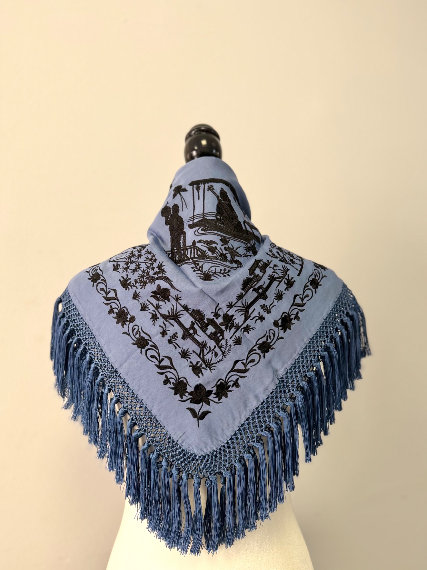 Mantón chinesco azul ducado bordado negro CUADRADO 60x60