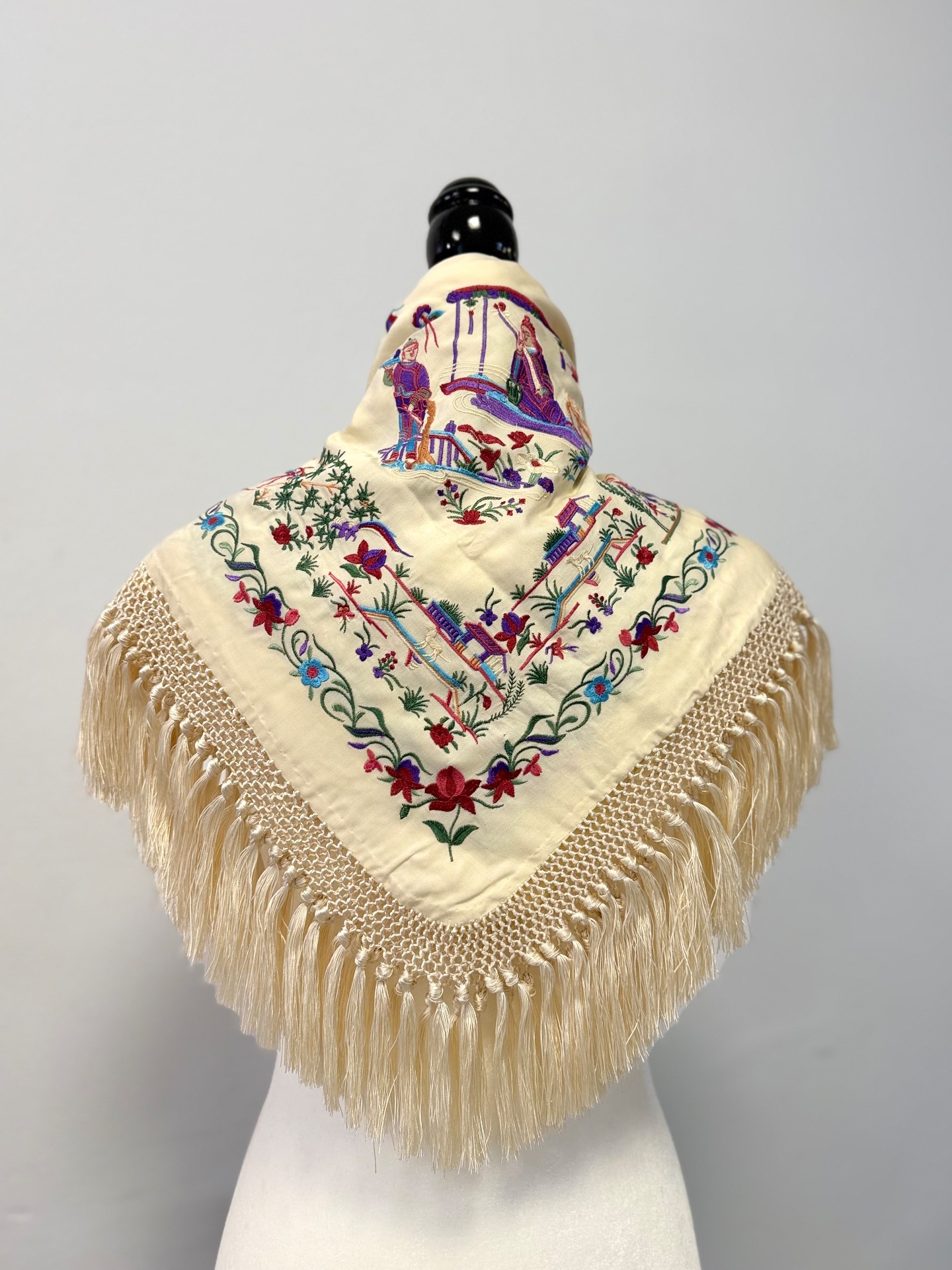 Mantón de seda, bordado en seda. Mide 60x60 sin contar flecos.