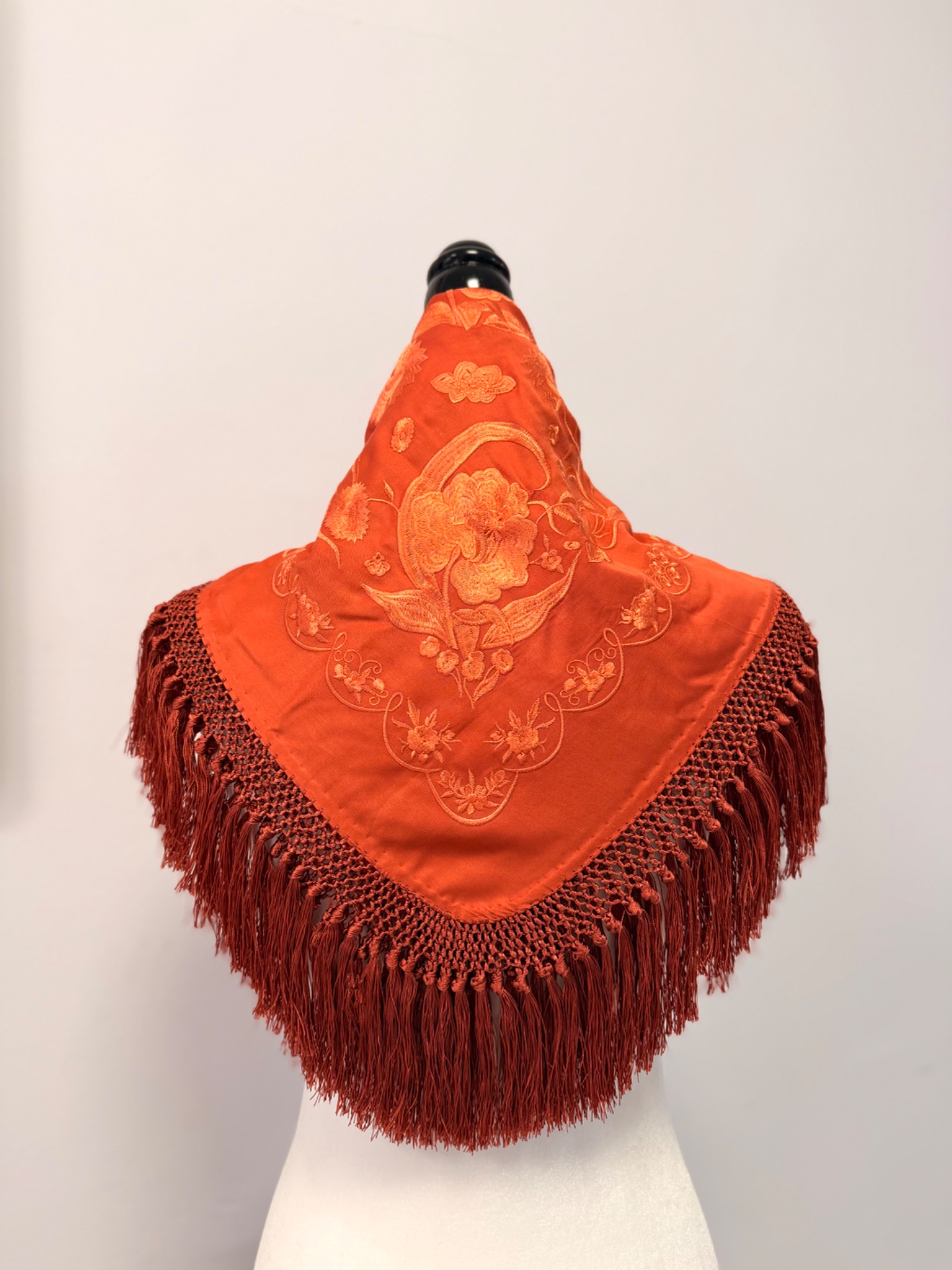 Mantón de seda, bordado en seda. Mide 60x60 sin contar flecos.