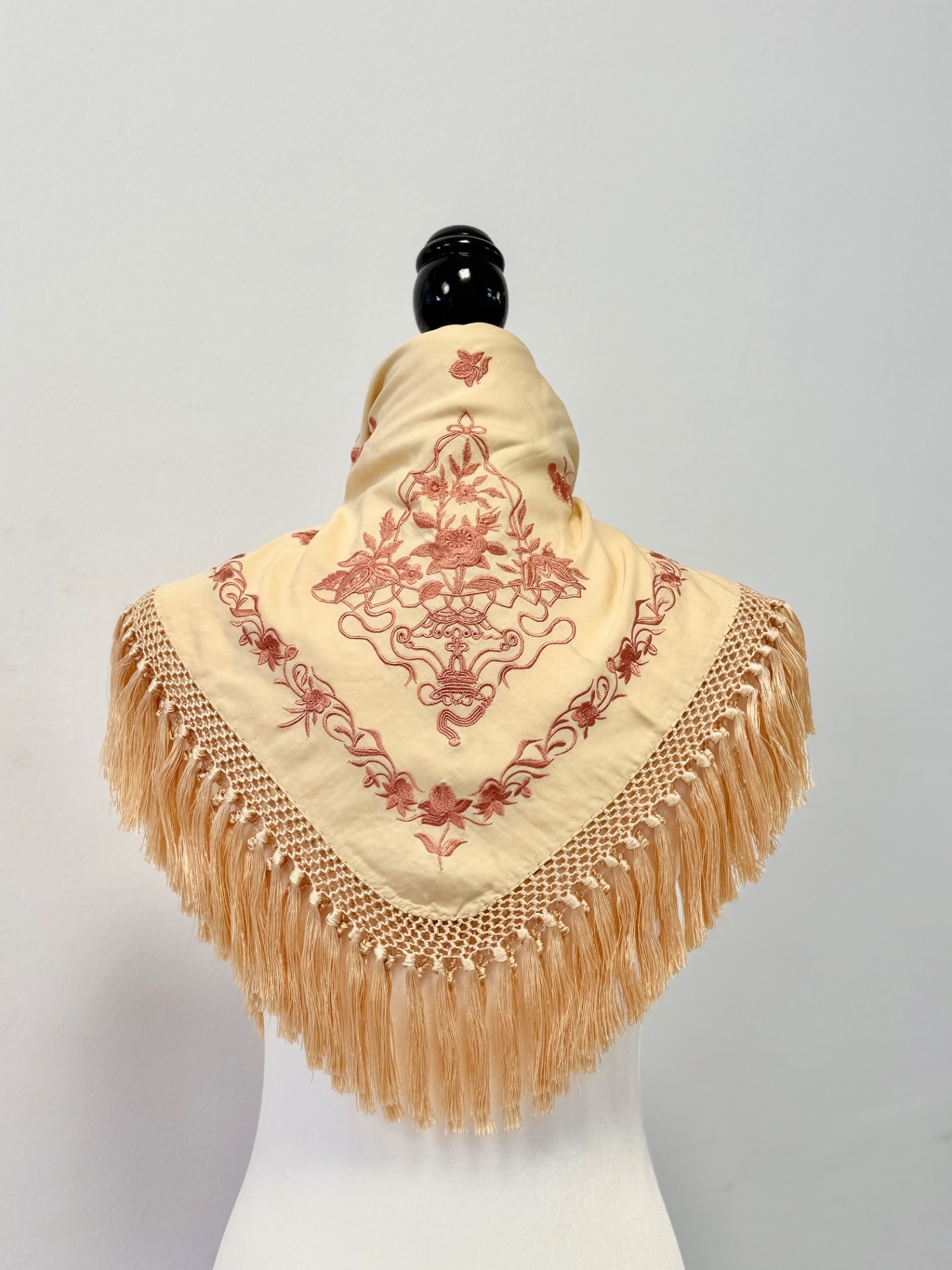 Mantón de seda, bordado en seda. Mide 60x60 sin contar flecos.