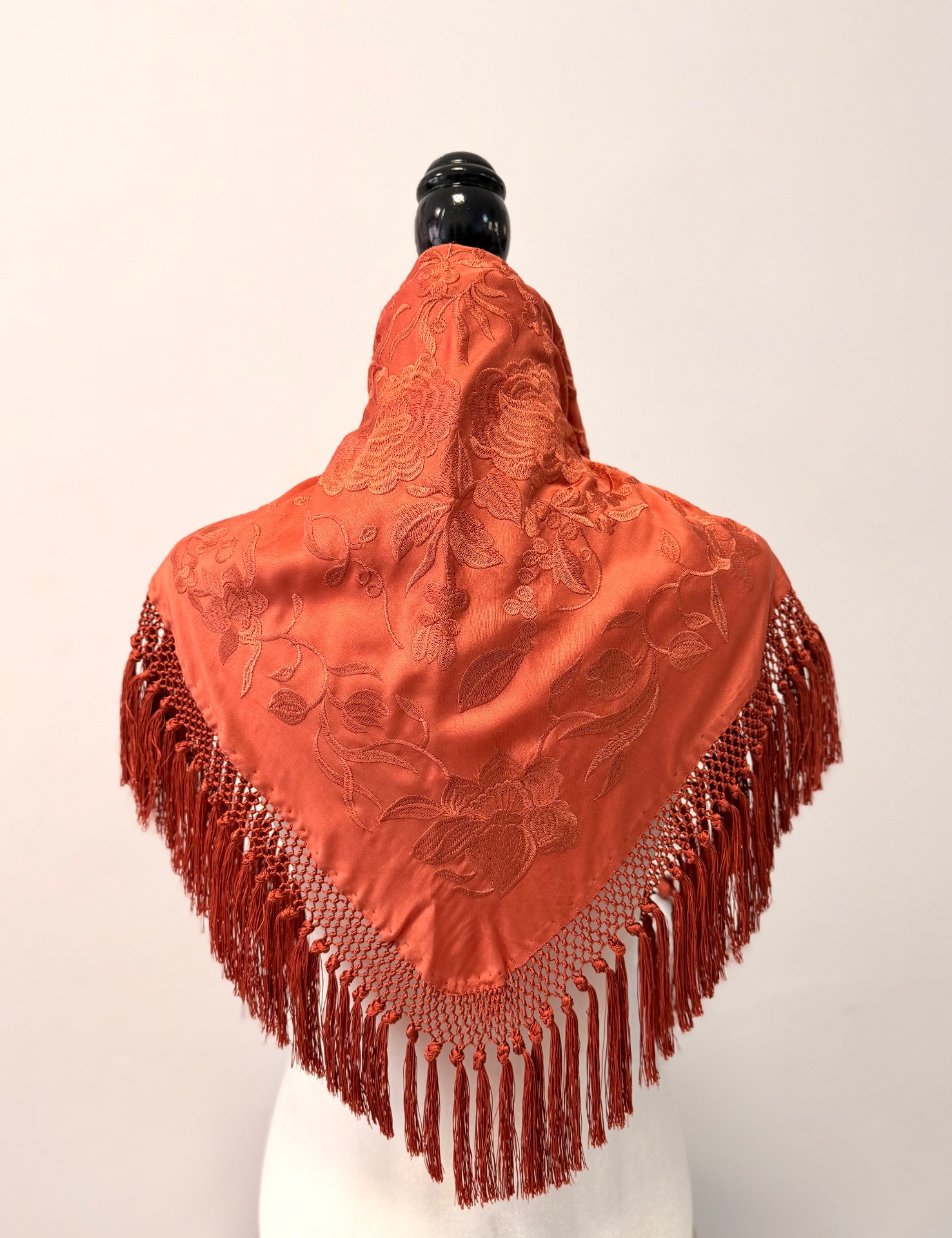Mantón triangular, seda bordado en seda. Mide 80x130x80 sin contar los flecos.